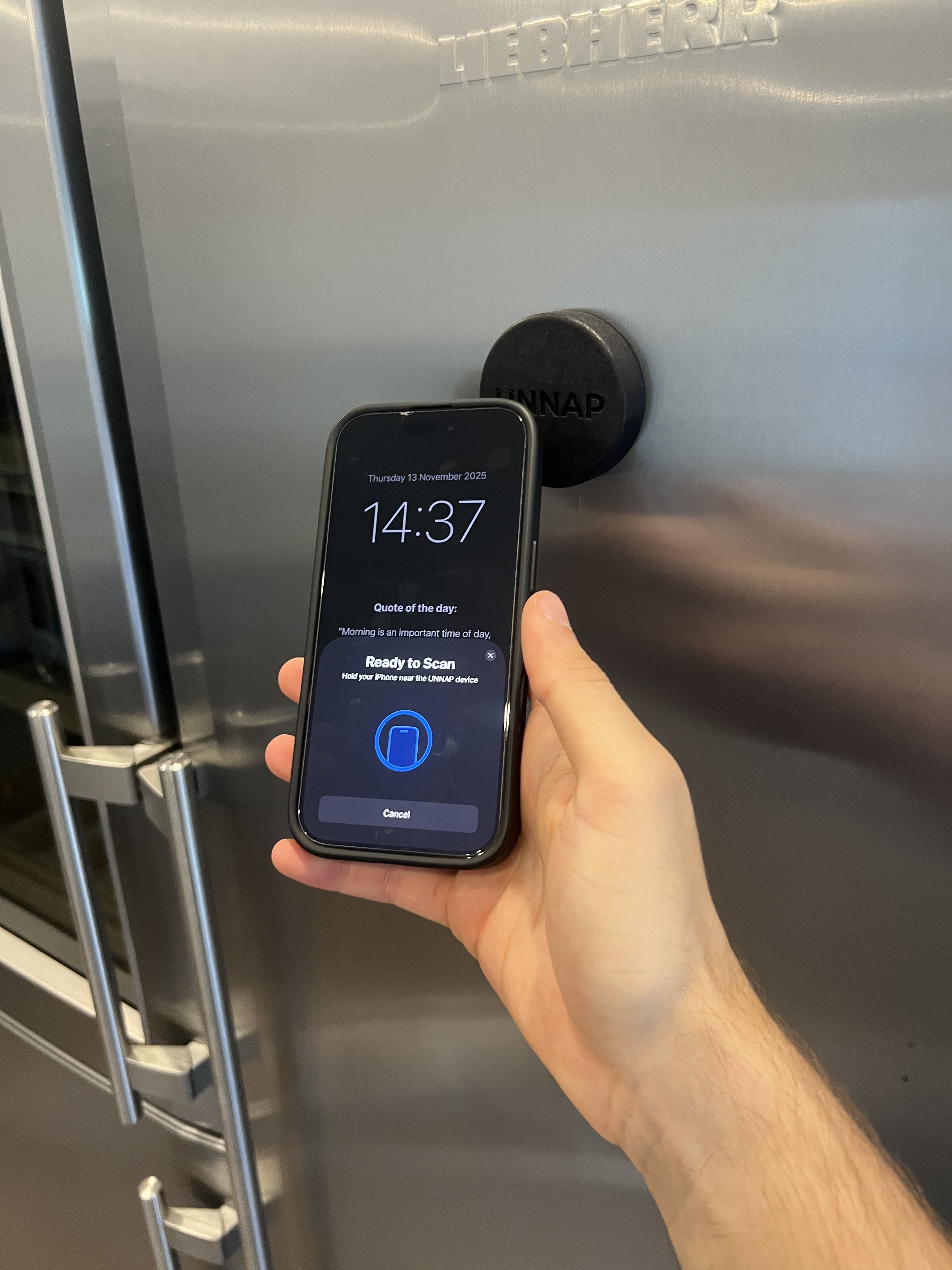 The UNNAP device is a small, engraved NFC device. Place it somewhere away from your bed — like the kitchen or bathroom. When the alarm rings, you must tap your phone on the UNNAP device to stop it. This physical movement helps you avoid hitting snooze and going back to sleep.